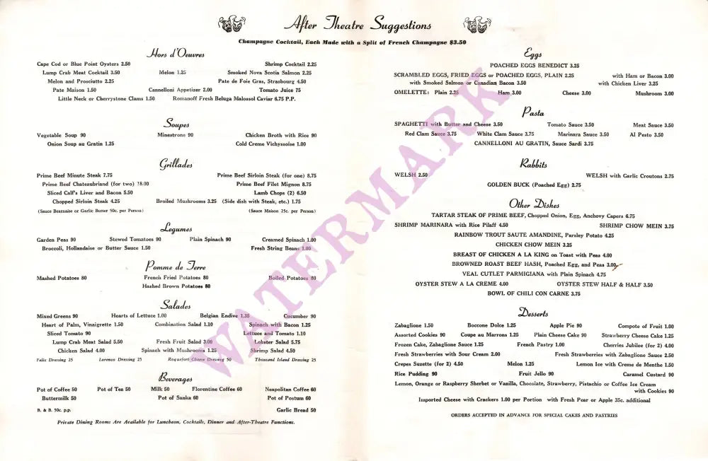 The comedy and tragedy masks on this 1960s Sardi's menu cover represent the restaurant's deep connection to New York’s theatre scene, highlighting its role as an historic hangout for actors, producers, and theater-goers.