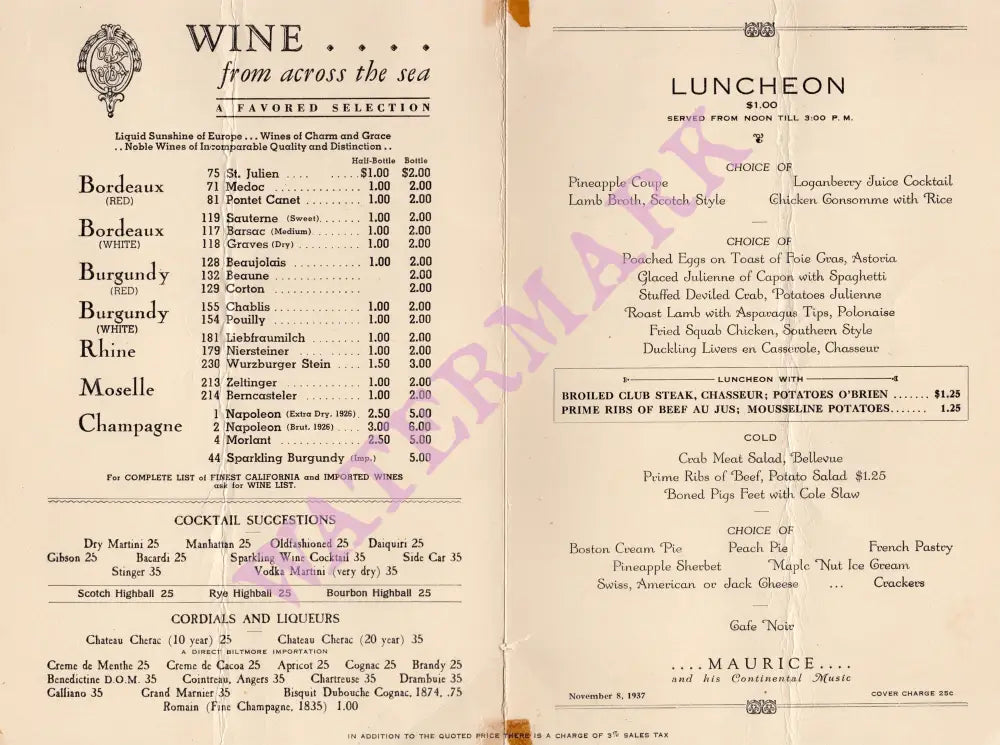 This exquisite menu cover was for luncheon service at the Biltmore Hotel In Los Angeles, California, in 1937.