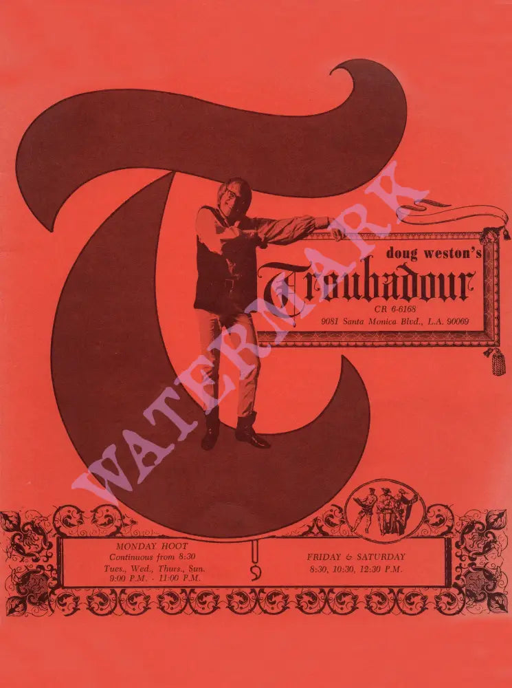 Opened in 1957 in West Hollywood, Doug Weston’s Troubadour became the epicenter of Los Angeles’s cultural scene and arguably one of the most important music venues in the world for its importance in breaking new acts.