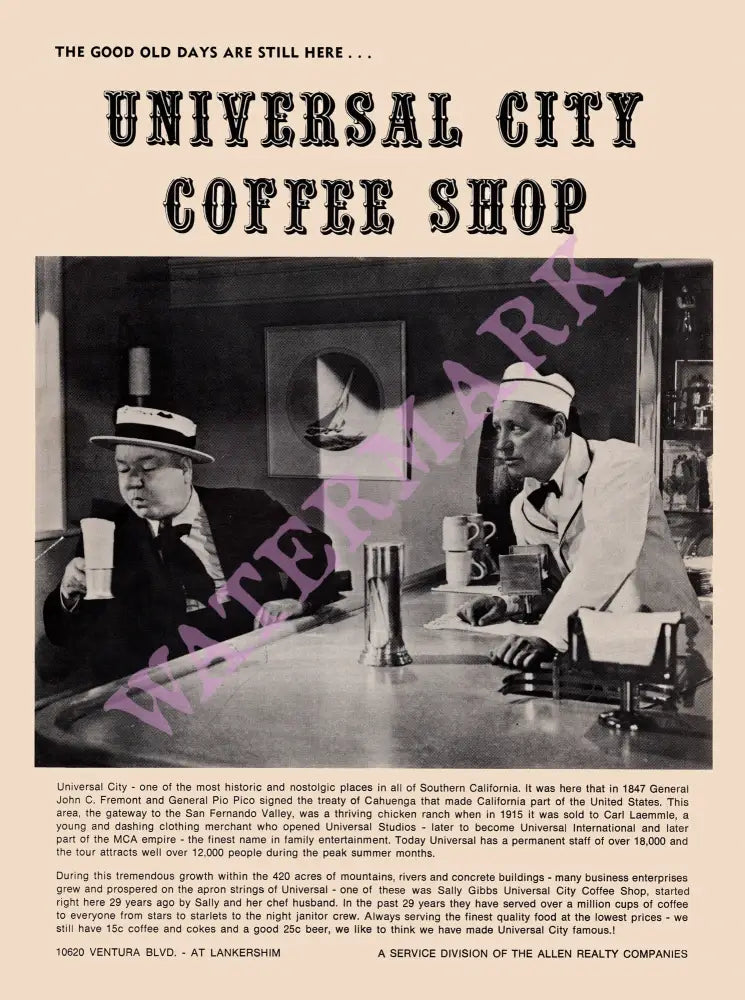 Established in 1946, the Universal City Coffee Shop was open 24 hours a day at the request of cast and crew members of the many round-the-clock productions happening at Universal Studios.
