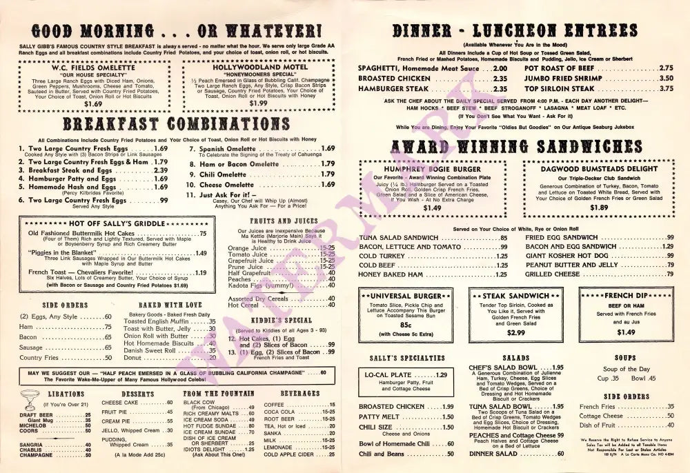 WC Fields was clearly a regular at this coffee shop - the house specialty was an omelette named after him. We also enjoyed hearing about the ‘favorite wake-me-upper of many famous Hollywood Celebrities.’ This was half a peach submerged in a ‘glass of bubbling California champagne.’