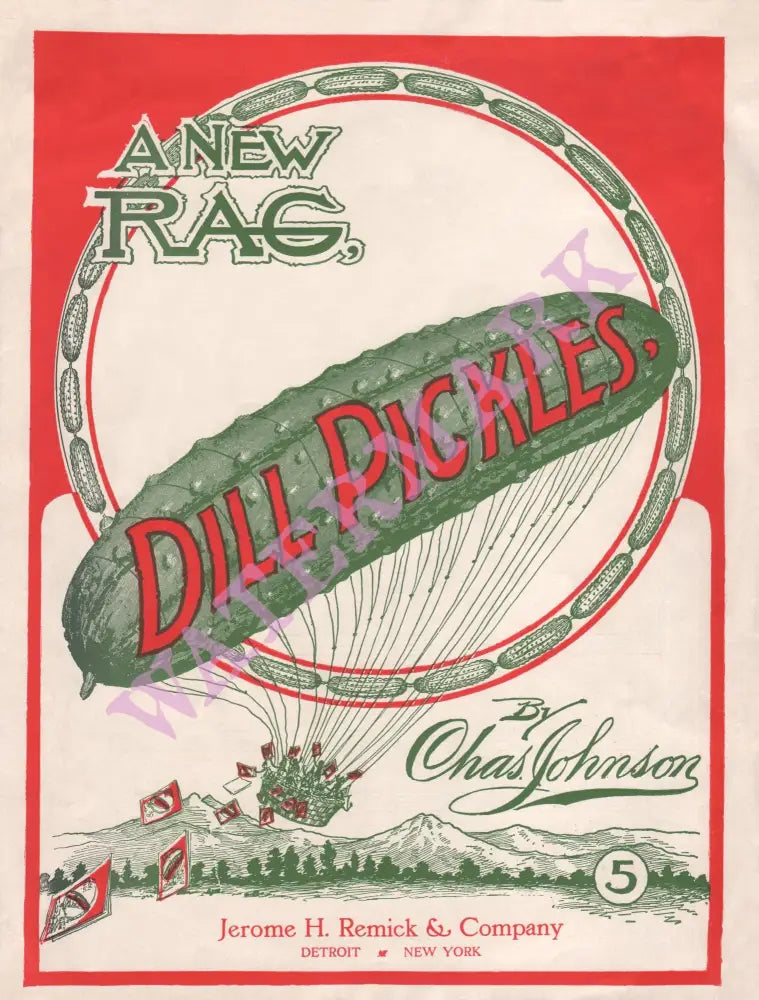 People bought sheet music in the same way that they download music today, and the front covers of published songs always sold more when they were eye-catching and colorful. This illustration shows a dill pickle as if it were a zeppelin, a floating airship.