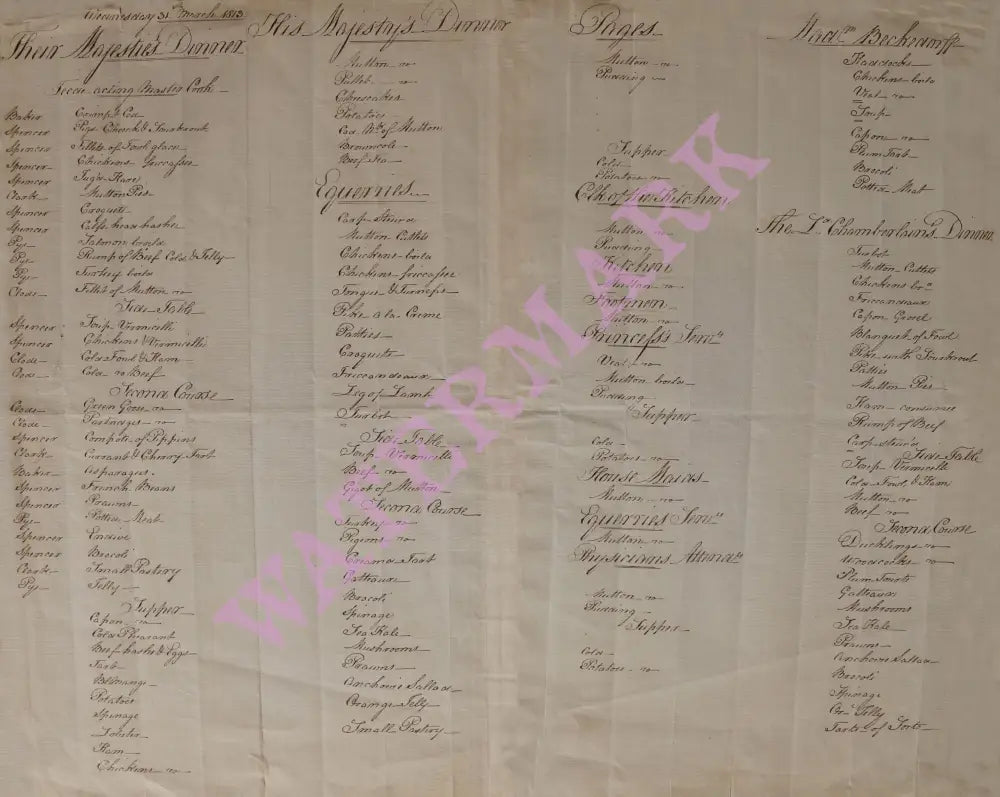 This is a rare working document, dated 1813, during the reign of King George III in England. Entitled Their Majesties Dinner, the original is written in ink on hand-made paper.
