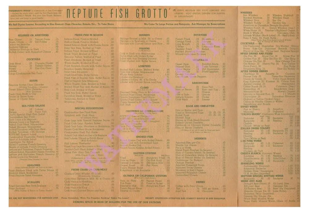 From Croatia.org: "One of the first good fish eating places upon approaching Fisherman’s Wharf is the Neptune at 2737 Taylor Street. The proprietors are Robert Soljack and Ernest Aviani from the Island of Brac, Dalmatia, Croatia. Robert Soljack claims five years of experience at Fisherman’s Wharf and he and Chef Aviani took over this historic location about one year ago in 1936. They renovated the building, made some changes and today have a comfortable eating house and surely a suggestion of good sea food with the open kitchen and charcoal broiler. When lunching or dining at the Neptune one may eat at the counter, or at open tables or in booths. About 140 persons can be accommodated at one time. The place is famous for its cioppino, fried crab legs, abalone, deviled crabs, charcoal broiled fish of various types, and other seafood specialties. Fish is bought from the boats when they arrive from the sea at Fisherman’s Wharf, and is served the same day. Menus are made out according to fish available. Some 300 meals are served daily. With such food, with such panorama of hills and bay, with such a picture of fishing scenes, a net mending, of crab cooking, of displays of fish for sale, of the teeming life of those who make their living by the sea spread before one, it is indeed a treat of treats to enjoy a fish dinner prepared as the specialists of the Neptune know how to cook it, and thus enter into one of the typical phases of life in San Francisco."