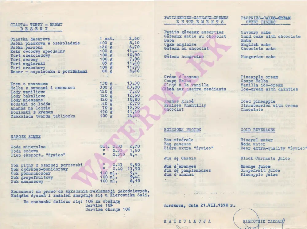 This menu’s illustration, by Z. Jrokowski, dates from 1962. The mermaid is a reference to the (freshwater) mermaid which has been a part of Warsaw’s legendary history for centuries, and on its coat of arms since 1622.