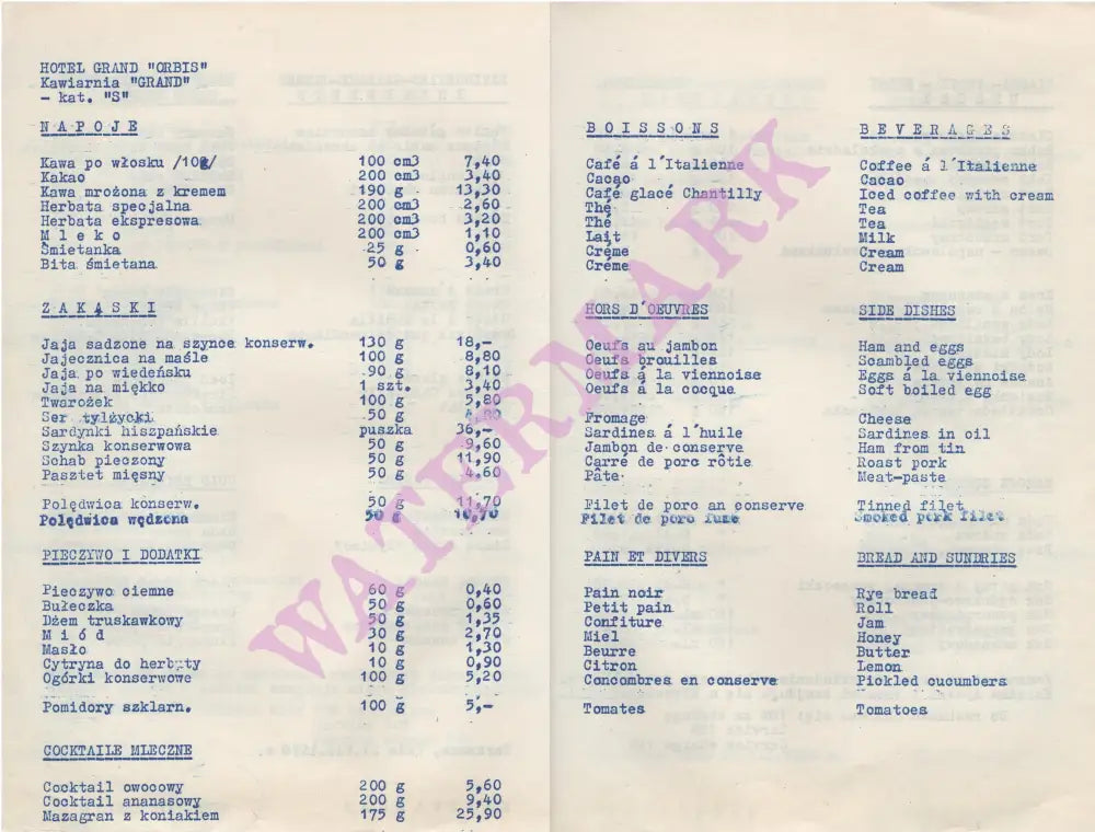 At the time this menu was in use the hotel was home to the Japanese and Ecuadorean embassies, with the Australian embassy joining in 1974. Until 2004, the hotel was also host to the Polish Olympic committee. The Grand Hotel’s decoration was inspired by abstract artists Joan Miró, as well as the traditional Polish decorative Oscypek cheese.