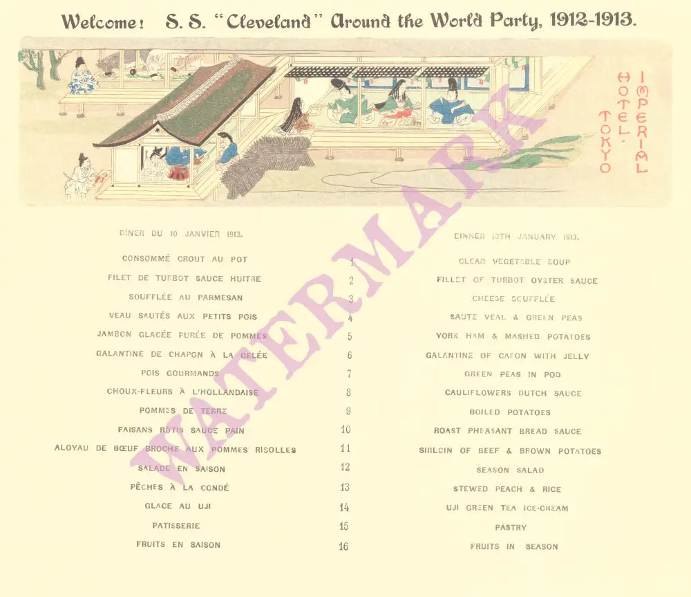 Strictly speaking, this is not a cruise ship menu but one that came from the Imperial Hotel in Tokyo, which hosted a dinner in 1913 for the lucky passengers who were on a round the world cruise on the SS Cleveland. At the time, not many Westerners went to Japan, so this must have been quite an experience. The façade of the Imperial Hotel, as it would have been at the time, is now located in the Meiji Mura museum and a modern one has taken its place. Such grand trips lasting 90 days or more were the preserve of the very rich, of course.