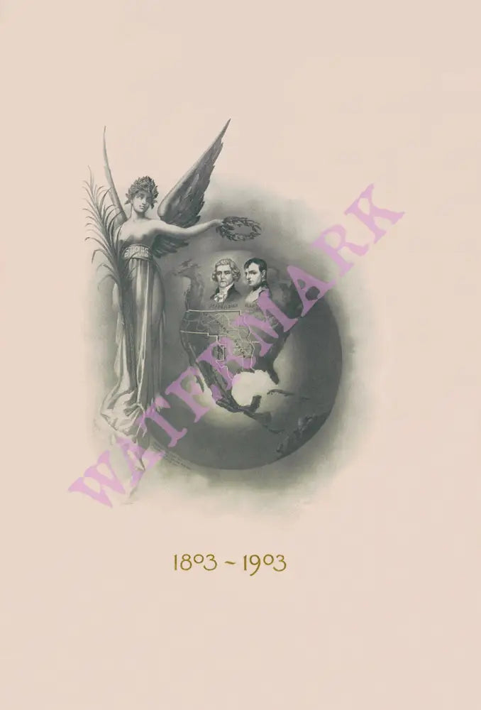 Front cover, showing am angel, George Washington and Napoleon Bonaparte, for a menu for a banquet given by the business men's league of St. Louis to commemorate the passage by Congress of the world's fair bill and to meet the members of the national commission at the Planters Hotel on Tuesday evening April 23rd, 1903. St.Louis.