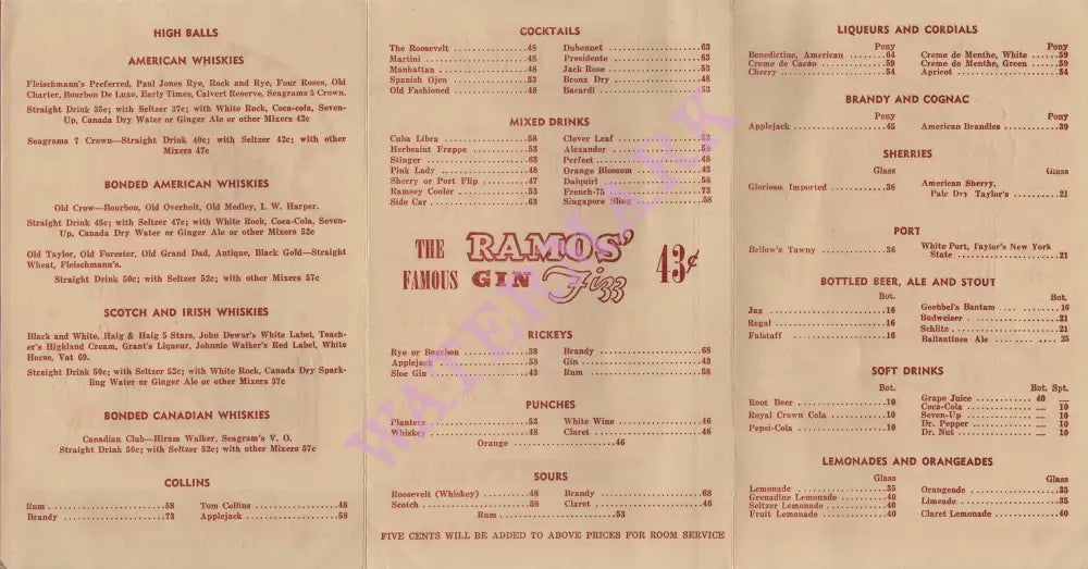 Cocktails, rickeys, punches, sours and high balls were on this drinks list from the Hotel New Orleans, Louisiana, in 1945. The star of the show, however, was the famous Ramos’ Gin Fizz which cost 43c at that time.