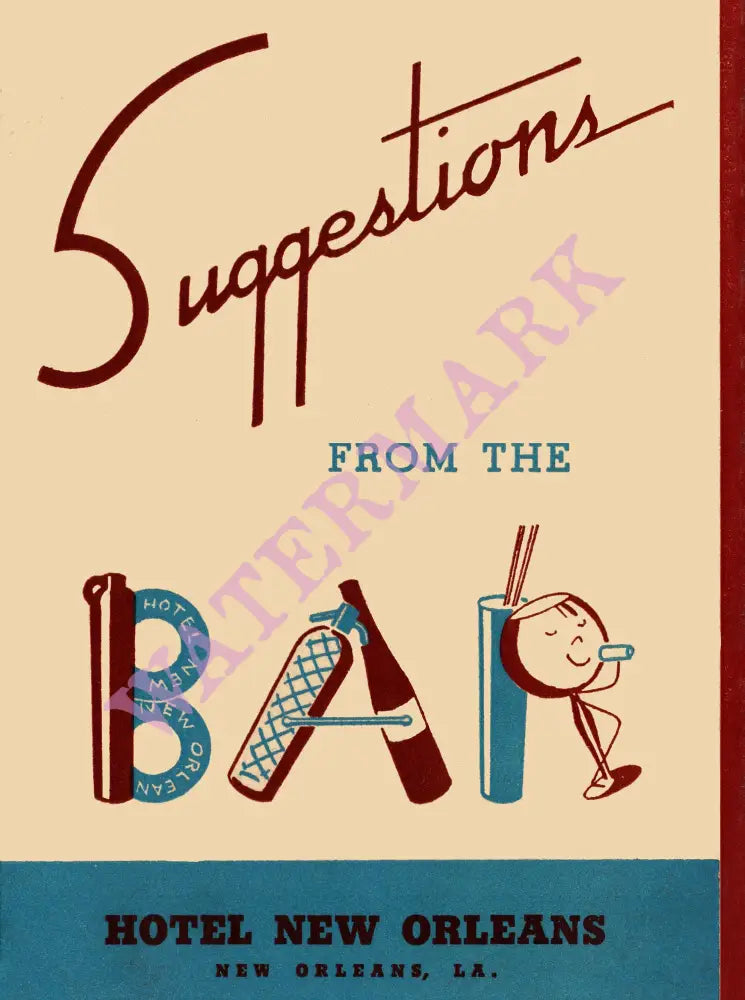 This menu cover with the word ‘bar’ cleverly illustrated was from the Hotel New Orleans that opened in 1907 on Canal Street. With an interesting font, great colors and witty graphics, it’s a fine example of imaginative vintage menu art.
