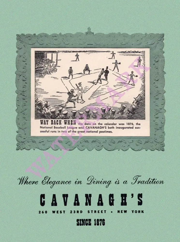 In 1876, Cavanagh’s was established as a twelve-seat clam bar, originally called Kenny’s, in New York City and at the same time the National League of Professional Baseball Clubs was formed. This menu wittily notes the inauguration of two of America’s favorite pastimes in the same year - eating and baseball.