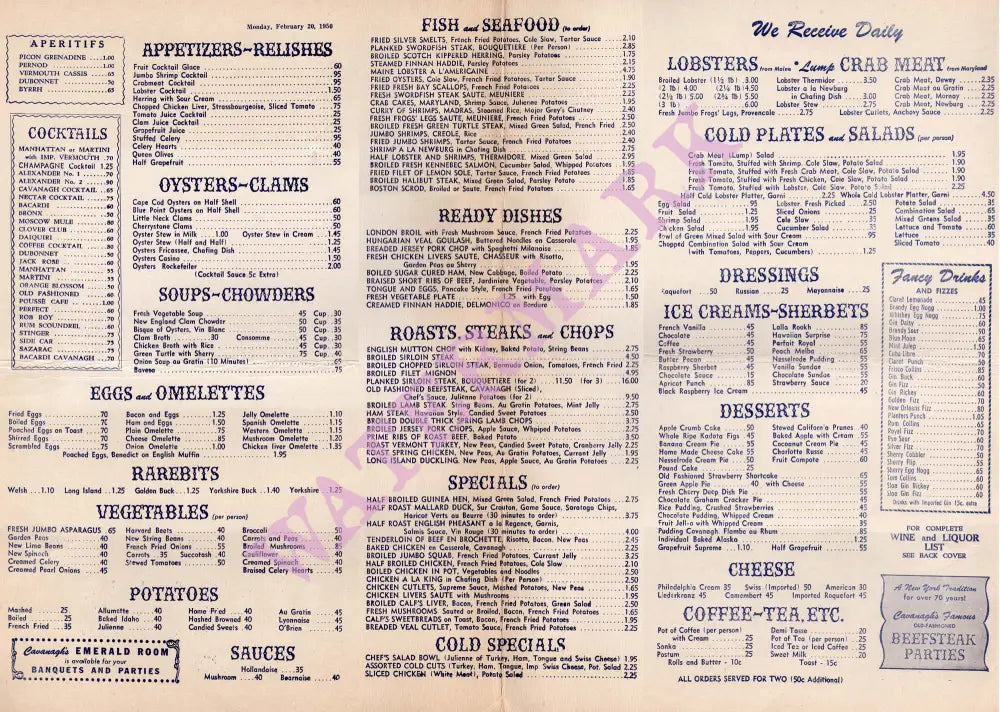 Unlike many other restaurants Cavanagh's survived the Prohibition years because it never had a bar and didn't rely on alcohol sales. The restaurant's early specialties included oyster stews, lobster, steaks, fried oysters and chops.