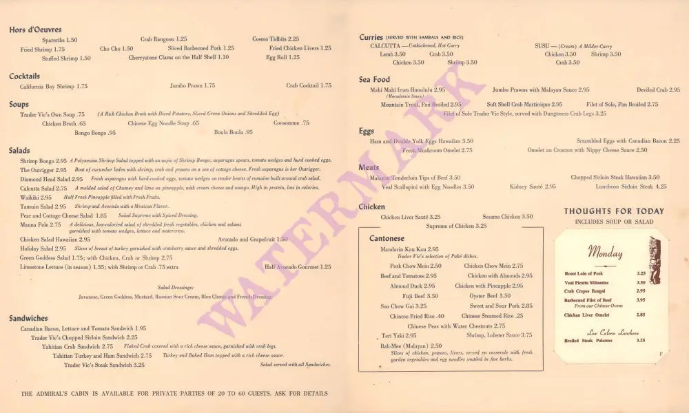 In the 1940s and 50s, Bergeron partnered with various hotel groups like Hilton to open Trader Vic’s in hotels, and this luncheon menu was from the company’s outpost on East 58th Street in New York. Its regulars included the film director Stanley Kubrick who is said to have first described his idea for 2001: A Space Odyssey here.