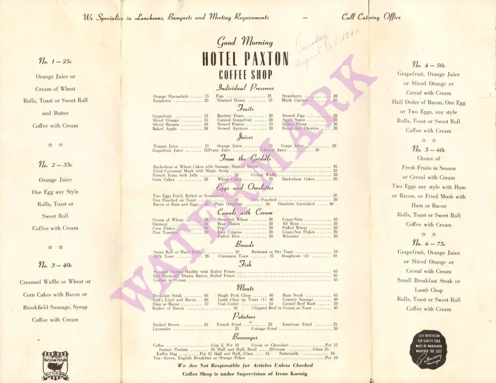 The first Paxton Manor was built in 1882 and named after William Paxton, a local legend who made his fortune in cattle and trains. President McKinley and Buffalo Bill Cody stayed there. It was demolished in 1927 to make way for the new Hotel Paxton. It opened for business on June 26, 1929. With interior design by Marshall, Field and Company, features included four dining rooms, a barbershop and a ballroom, along with amenities including elevators, telegraph and cable services, and a rooftop dog kennel with runways. Room rates started at $2.50 a night. The hotel closed in 1964 and the building reopened in 2004 as The Paxton Grand Condominium.