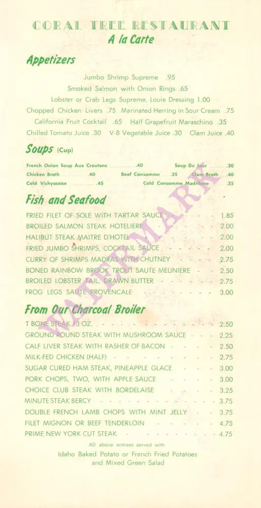 This is a 1950s menu from The Coral Tree restaurant at The Palm Springs Hotel which was located where the Hyatt Palm Springs now stands.