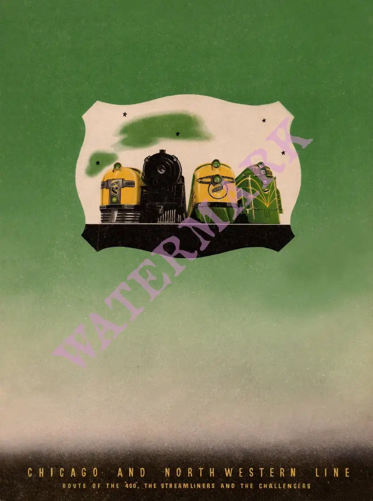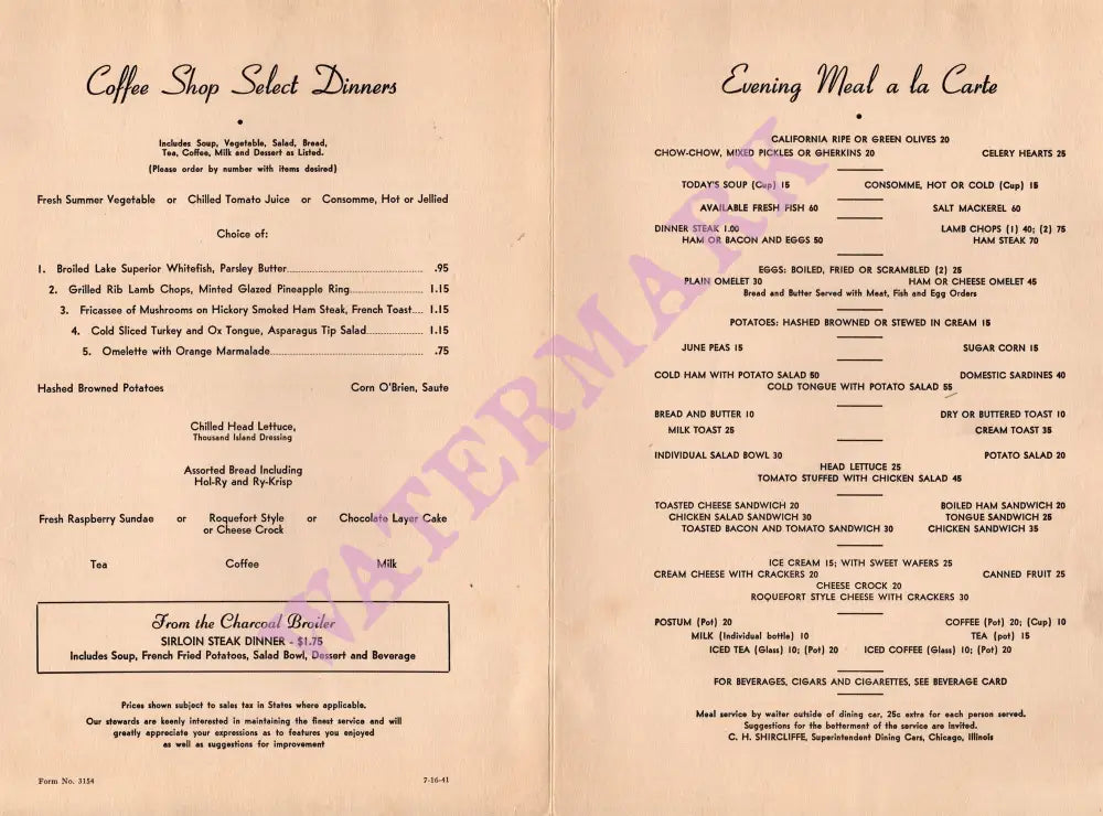 This marvelous menu from 1941 features four of the railroad’s most famous locomotives. We think they are from left to right an F7 Diesel Electric, a Class H steam locomotive, an EMD E Diesel and a streamlined Class E4 “Hudson” steam loco.