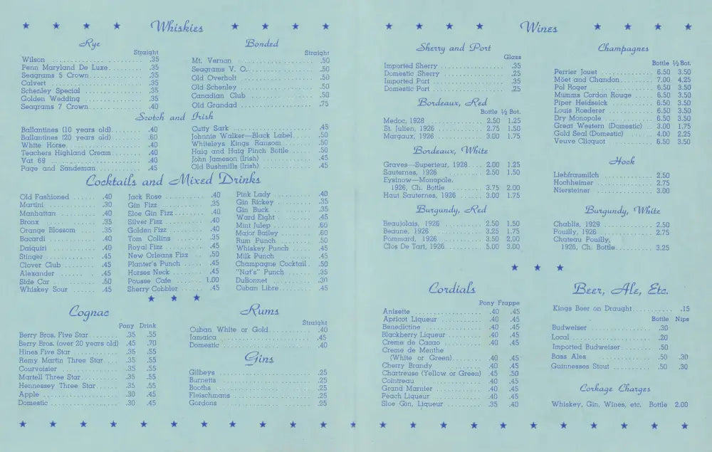This menu was for the bar aboard one of the steamboats that transported passengers overnight in the 1930s.