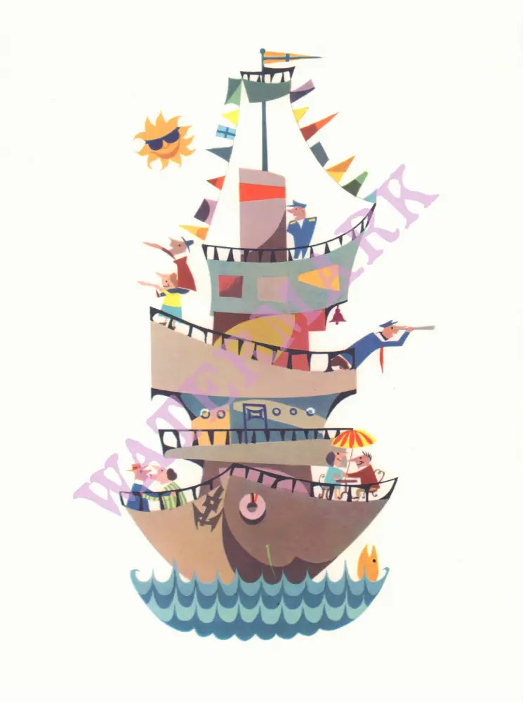 This delightful illustration of a multi-deck ship with crew members keeping watch while passengers enjoy life at sea won first prize in a 1960 competition held by the Dutch shipping line Royal Rotterdam Lloyd.