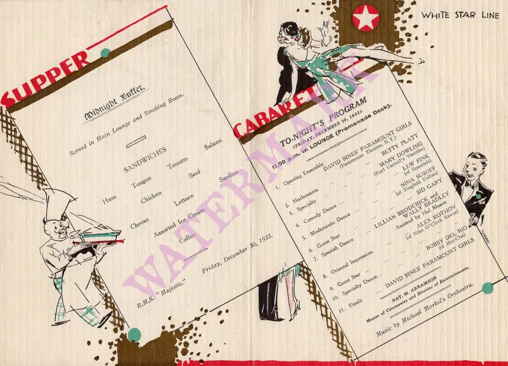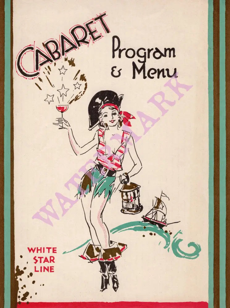 This 1932 menu depicting a glamorous lady pirate in swashbuckling boots on the cover may have come from one of these cruises. The interior details a full program of music and dance and a selection of midnight snacks. The artist was T.J. Bond who created a number of White Star menu covers.