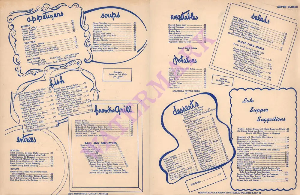 Patrons could snack on a fried oyster sandwich for 40c or eat a T-bone steak dinner for $2.50.