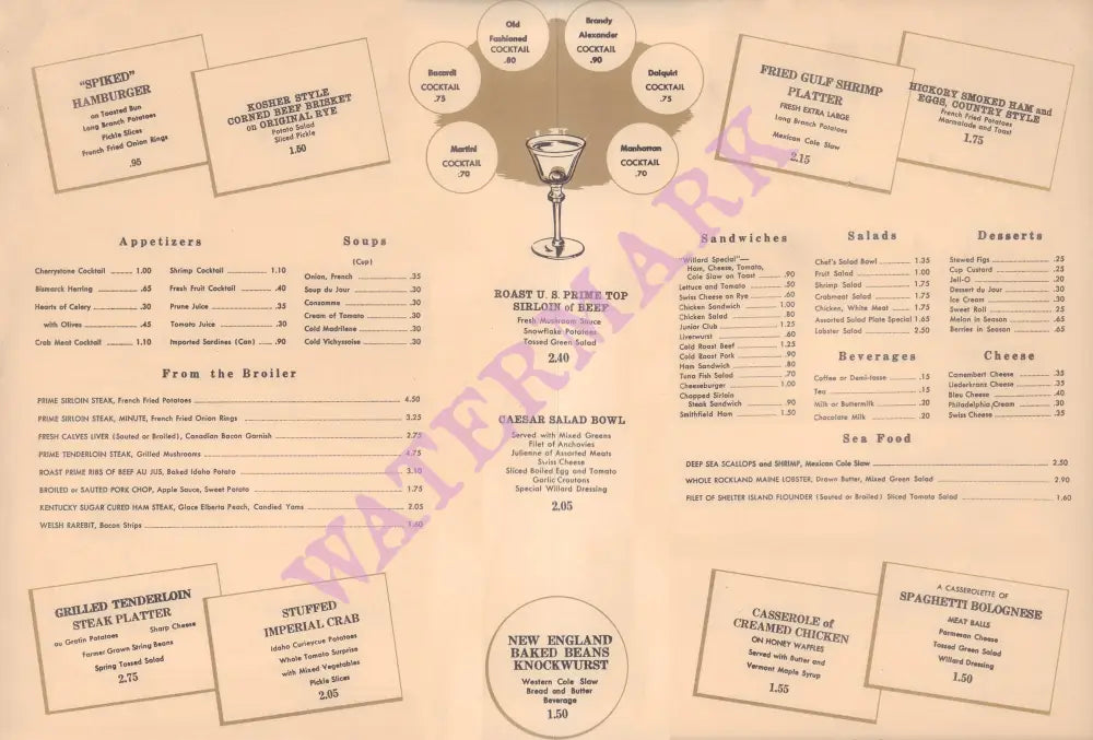 Though this was a Willard coffee house menu, dated 1969, cocktails were served and cost only 70 cents!