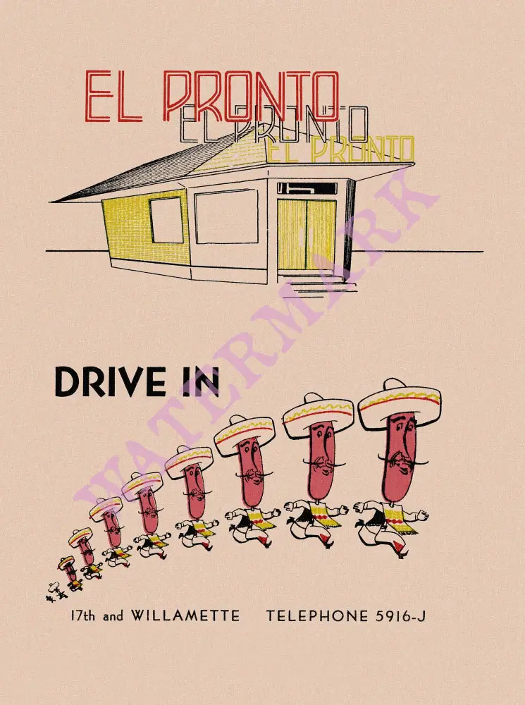 The El Pronto was the first drive-in to open in Eugene, Oregon, and apparently caused a bit of a fuss among locals. It was November 1946 and parents feared it would become a gathering place for teenagers, possibly because it had a jukebox. Kids were warned to stay away but they ignored this, of course, and El Pronto became a popular hangout.