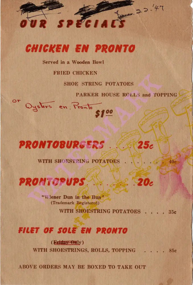 Favorite items on the menu were the ProntoPups, advertised as ‘the niftiest, thriftiest hot dogs in town.’ They cost 20c or six for $1.