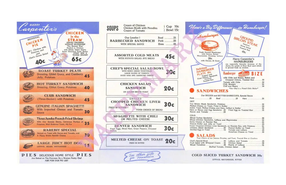 There were five Harry Carpenter's Sandwich Stands including one that was located at the corner of Sunset and Vine that was close to the movie and television studios. Harry Carpenter called his places "The Original Modern Drive-In" which were open 24 hours a day. Customers could have a "Real Hamburger " sandwich for 15 cents and any other "Sit'N Eat" sandwich in their car. Service was also available at the gleaming tiled "sanitized" counter inside.