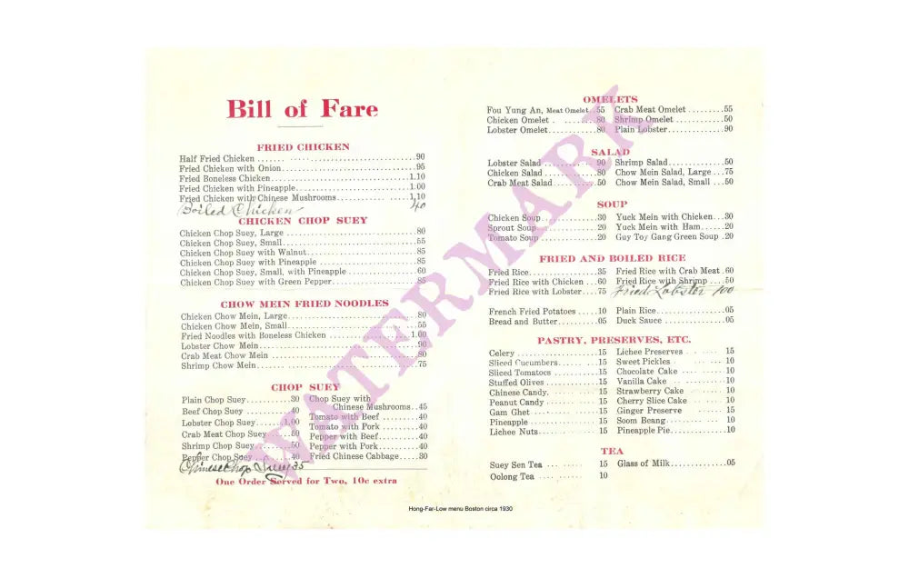 Established in 1879, Hong Far Low was one of the first Chinese restaurants in the United States. This menu figures prominently in Wing Kai To's important history book, "Chinese in Boston: 1870-1965". A whole fried lobster cost $1 in the 1930s and a boneless chicken cost ten cents more.