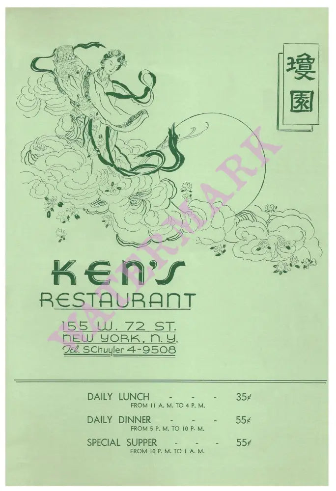 This 1942 celadon green menu proclaims its food is "Prepared the Same Way as in Canton" and also politely tells patrons, "You will do us a favor by reporting to us any inattention on the part of our employees."