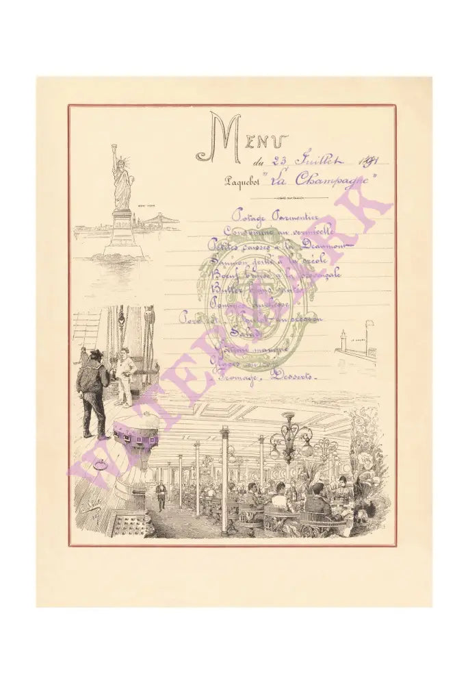 This glorious menu, which is dated 1891, came from a steamship called La Champagne which travelled the Le Havre to New York route. It carried mail between the two countries – sometimes called Pacquebot mail – as well as passengers and cargo. The paper was a lovely rose blush color and the ink etchings show life aboard the ship; there is a scene on deck, passengers being served in an ornate dining room and the view of the Statue of Liberty that those on board would have seen as they reached the end of their journey. Operated by Compagnie Générale Transatlantique.