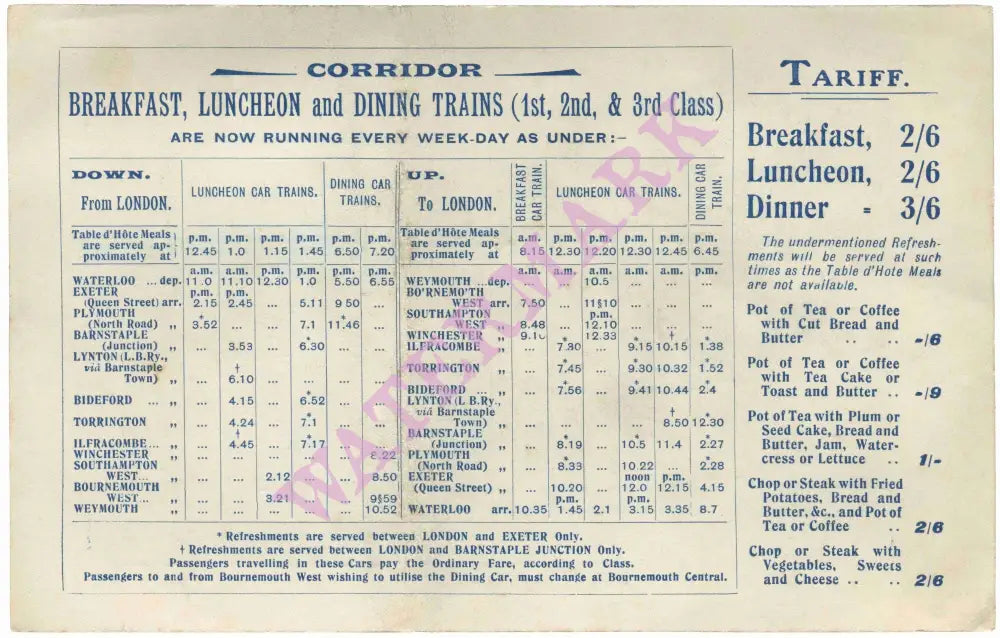 The London and South Western Railway Company served the south and west of England from 1838 to 1922. They were one of the great pioneers of Britain's rail network and were responsible for the rebuilding of Waterloo and its becoming one of the great stations of the world. Their trains offered all three classes of passenger Breakfast, Luncheon and Dining Car carriages which served Table d'Hôte meals at set times during the day and evening. This two shillings and sixpence (12 1/2 pence in decimal) luncheon menu from October 1906 would have cost the 2010 (only data available) equivalent of £10.50 using the retail price index or £42.25 using average earnings. So not inexpensive whichever measure you use. On offer for this luncheon was Longchamp Soup (pea and ham), Sole in white wine or Roast Beef both served with cabbage and potatoes and to finish you off Bread and Butter Pudding, Cheese and if you still had room you could, for 3p extra, also have fruit.