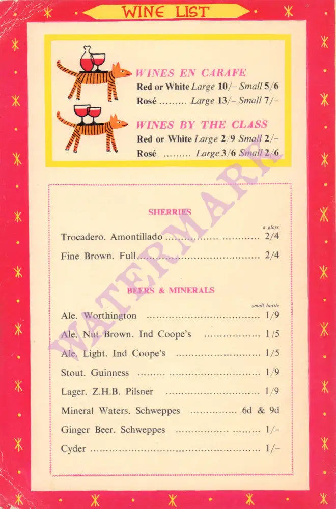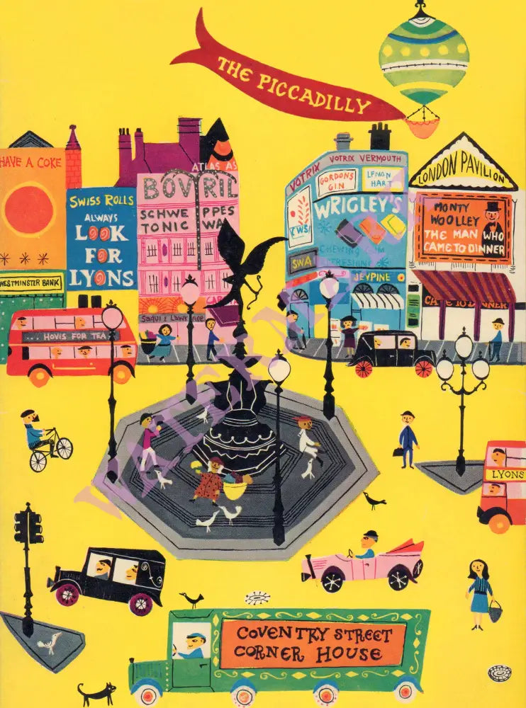Located on Coventry Street in the heart of the city’s West End, the cheerful illustration shows nearby Piccadilly Circus and its Eros Fountain, still one of the city’s top landmarks.