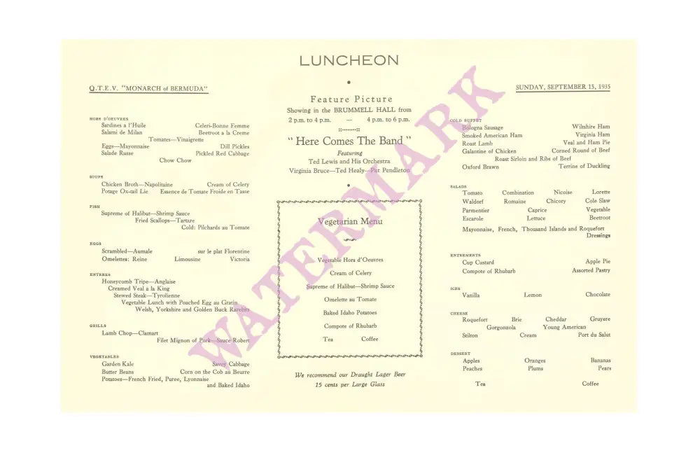 This vintage menu has a charming illustration of a fairy plucking fruit in a magical orchard and is unusual because it does not have a maritime theme. Dated 1932 and from the Furness Bermuda Line, it was one of the “millionaire” ships which held only first class passengers. There was room for just over 800 passengers on the Monarch of Bermuda which sailed from New York to Bermuda and it was luxury all the way. A lovely vintage menu example from the grand era of passenger ship travel.