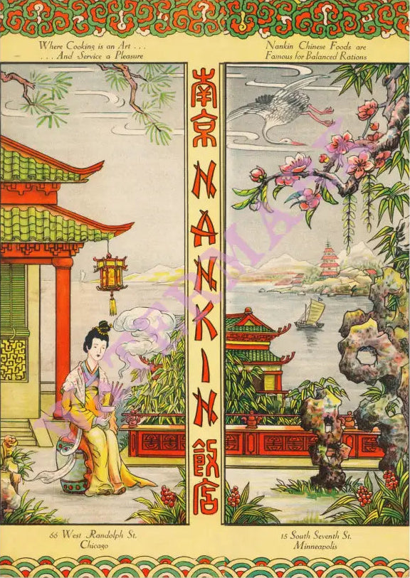"Where cooking is an art …and service is a pleasure" says this lovely and delicate 1941 menu from The Nankin restaurant which had locations in Chicago and Minneapolis. The interior menu is beautifully illustrated too, with pictures of Chinese pagodas, Chinese lanterns, a fisherman and a Chinese lady serving a pot of steaming rice. As always in this era, Chinese restaurants served American and Chinese food to cater to all tastes. The Nankin also had its own soda fountain.