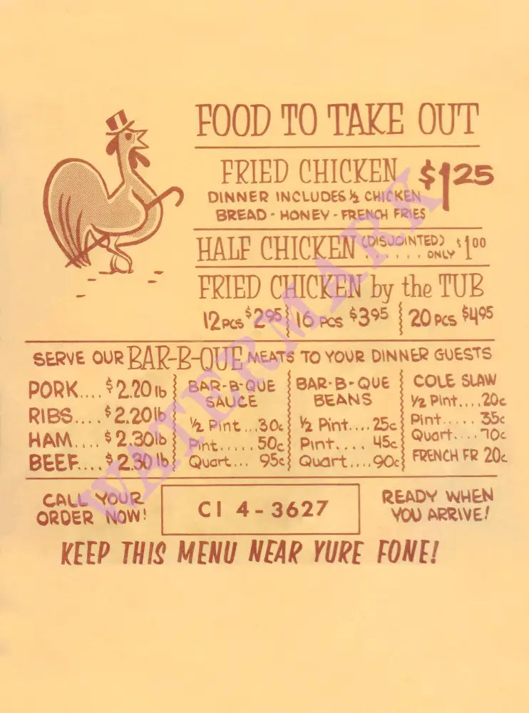 Ozark Bar B Q still has CI – short for Citrus – as its telephone exchange. This was phased out in 1963 so we believe this menu was from shortly before that date.