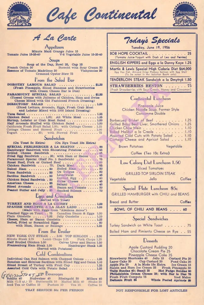 June 19 1956 Menu from the commissary at Paramount Pictures' studio lot in Hollywood. The featured celebrity dishes include Dorothy Lamour Salad (Fresh Pineapple, Sliced Bananas and Strawberries with Cream Cheese Bar le Duc), and Today's Specials of a Bob Hope Cocktail (tomato Juice-Yoghurt with Dash of Lea and Perrins), English Kippers and Eggs a la Danny Kaye, (Dean) Martin & (Jerry) Lewis Special High Calorie Diet $64,000 (Egg Foo Fish, Almond Crisp Plateau Salmon with Egg Shell - To be eaten in the isolation Booth only) and Strawberries (Charlton) Heston (Fresh Strawberries with Sour Cream, Honey and Cinnamon). Dean Martin split-up the Martin & Lewis comedy duo on July 25th 1956 and Charlton Heston's blockbuster movie "The Ten Commandments" was released later in the year on 8th of November.