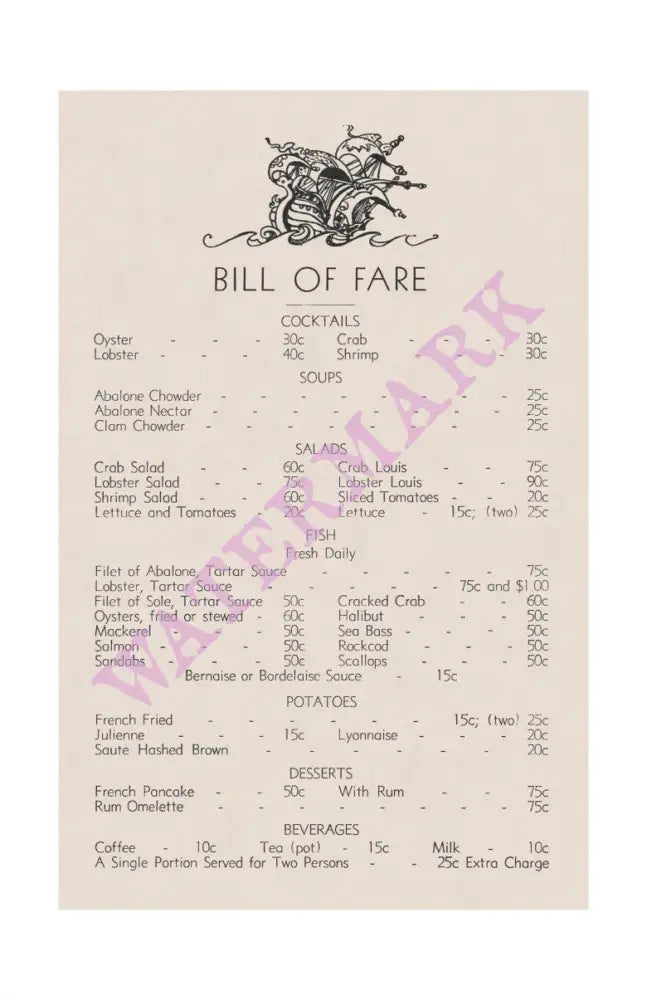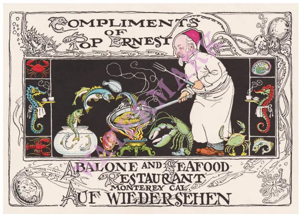 This menu cover is one of our favorites, created by two artists. The Uruguayan-born American cartoonist and illustrator Jo Mora drew the center illustration and the outside lettering was done by American painter Armin Hansen. They both did the work in exchange for abalone dinners.