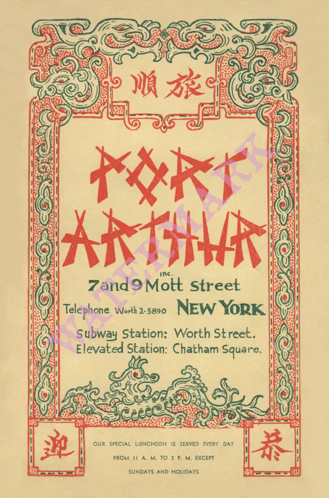 A Chinese immigrant, Chu Gam Fai, established The Port Arthur Restaurant on New York's Mott Street in 1897, naming it after his home city on China's northeast coast. With a garish pagoda-style frontage, the property stood out among the joss houses, restaurants, bars, nightclubs and gambling parlors of the Lower East Side. Located on the second and third floors of 7-9 Mott Street, it became a magnet for "slummers" – American tourists looking to do something exotic in the evenings. They sat at mahogany tables inlaid with mother of pearl, ate chop suey, listened to music played on a baby grand piano and congratulated themselves on their spirit of adventure. When Port Arthur became the first Chinese restaurant in the city to obtain a liquor license, it became an even more risqué and fashionable place to be, though in truth, there was never any danger attached to going there. Local Chinese made the restaurant their prime destination for weddings and family ceremonial dinners, taking over the banquet hall upstairs. The Port Arthur Restaurant operated continuously for 85 years before closing.