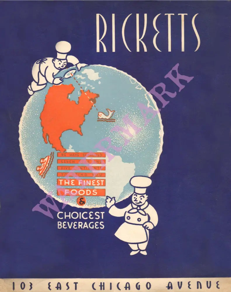 Mary Ricketts opened her first dining establishment in Chicago in 1898. Her three sons followed her into the hospitality business and operated some of the city’s most popular restaurants. This imaginative menu cover is from the 1940s.
