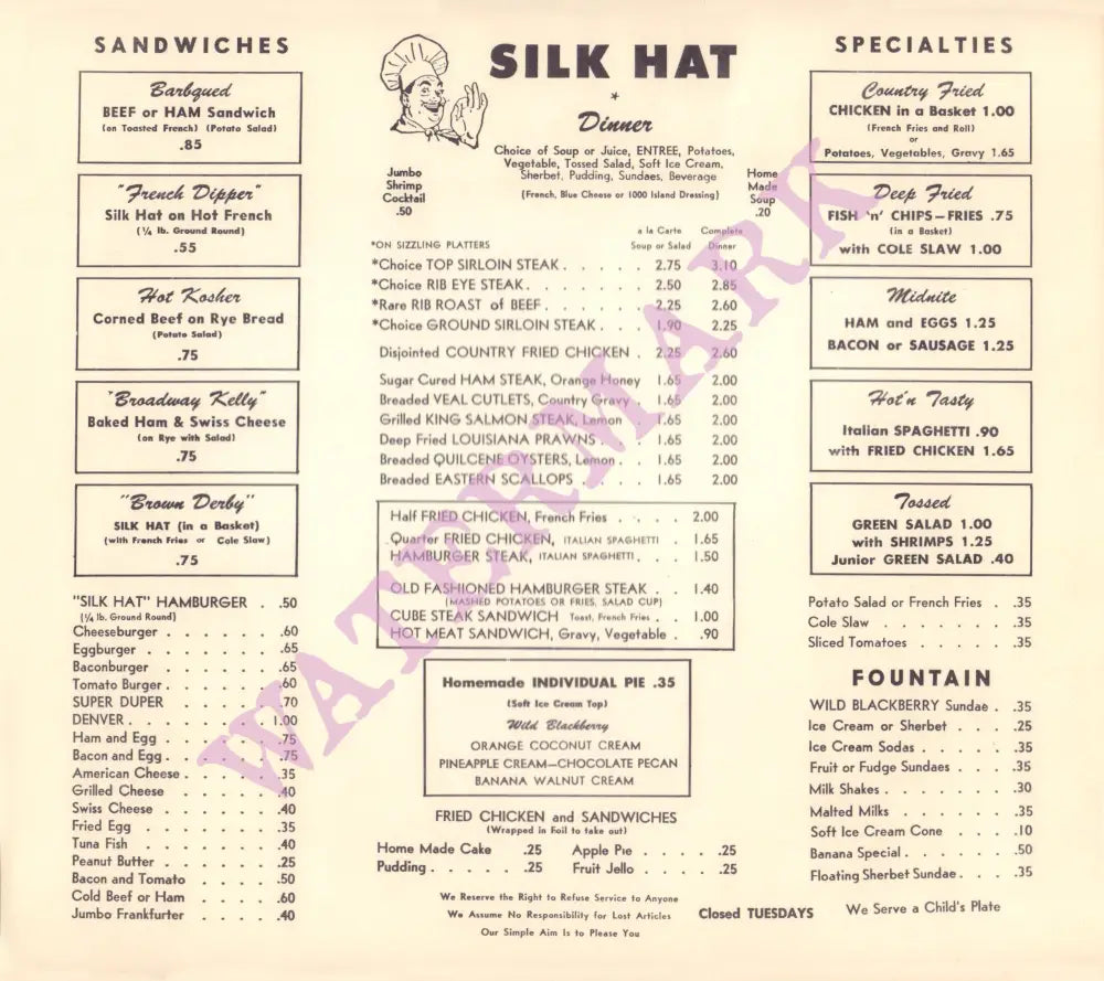 The proprietor of The Silk Hat was Louie Ridean – his name is posted on one of the trees, but we don’t yet know much else about him, apart from the fact that he had very good taste in vintage menu art! If anyone does know more about this restaurant, please let us know.