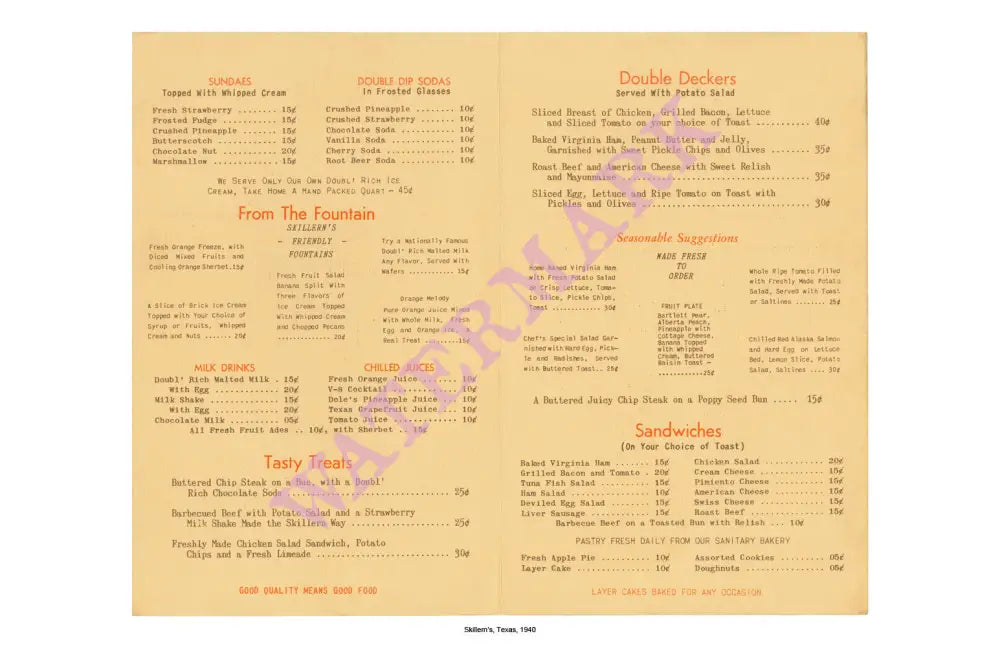 An attractive cowgirl uses a loop of rope to spell out the word menu on this vintage soda fountain cover from the famous Texas drug store Skillern's. Established in 1895, generations of children queued up for its famous "doubl' rich" ice-creams and chocolate sodas – they also got those treats free when their parents bought school supplies at Skillern's. There were dozens of Skillern drug stores across the lone star state. This simple but strikingly effective menu cover with great graphics and eye-catching illustrations is a reminder of a beloved chain that closed down in the 70s.