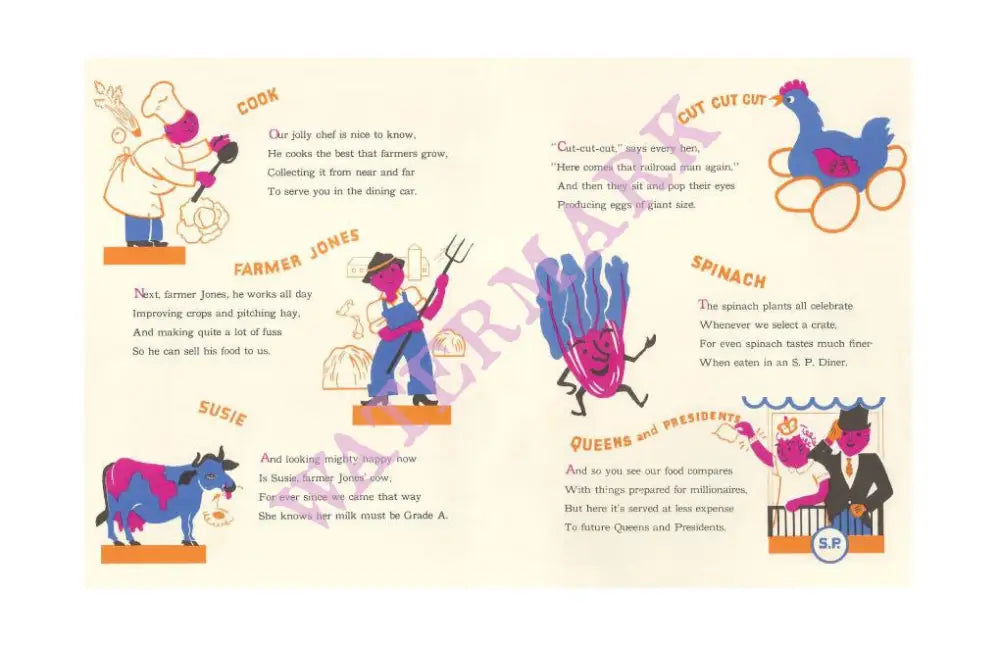 As rail travel evolved throughout the US, attractive amenities were created to enhance passenger experience and provided ways to stay ahead of the competition. Dining cars became de rigueur and families that were traveling were well attended to. Children's menus were designed to entertain the kiddies providing clever but familiar graphics, often accompanied by stories and poems that parents could read aloud, and offering what the railroad's culinary wizards thought appropriate. Mom and dad were assured that their children would be well entertained while nibbling on a PB & J sandwich and looking out at the landscape passing by.