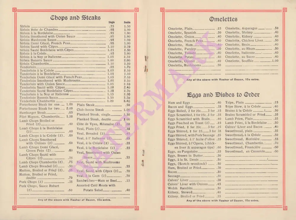 There was a fine wine list with clarets and champagne and cocktails cost $15c. A ladies annex was upstairs as well as private banqueting rooms.