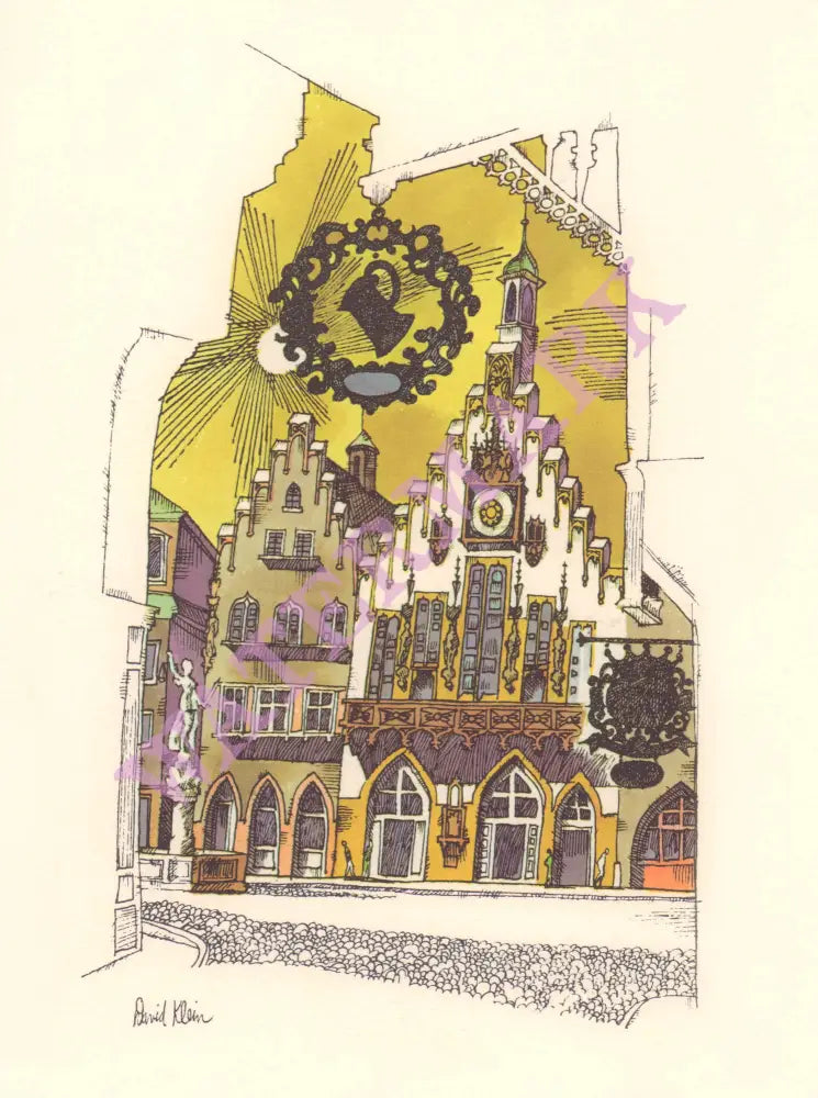 This beautiful image of the Frankfurt's Römerberg Square was created by the influential American artist David Klein, who produced posters for Broadway theatre productions, Hollywood films, the US Army and various corporate clients.
