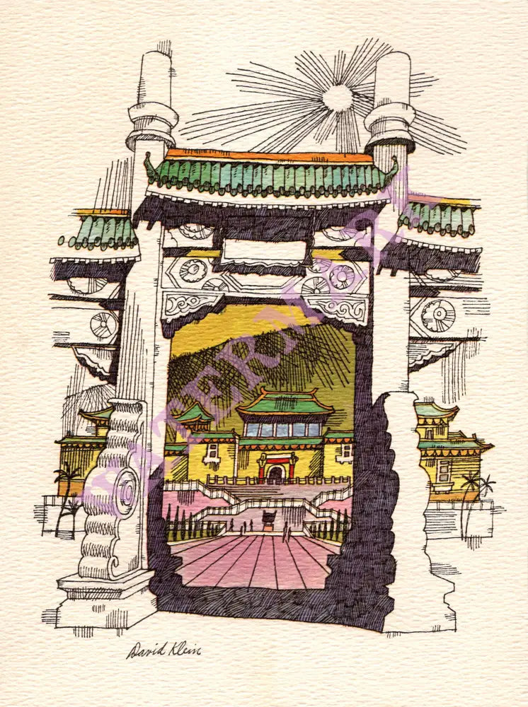 This beautiful image of the National Palace Museum Gate in Taipei, Taiwan was created by the influential American artist David Klein, who produced posters for Broadway theatre productions, Hollywood films, the US Army and various corporate clients.