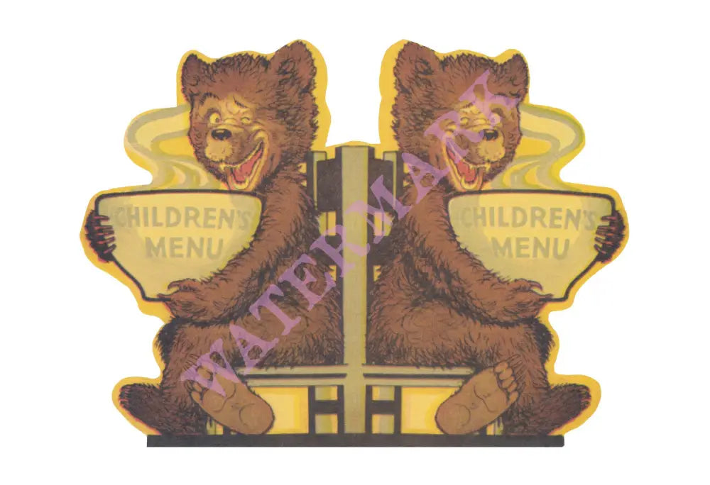 These cute little bears were on the cover of this 1940s children's menu from the Union Pacific Railroad. Among the items on offer to little boys and girls were pureed prunes, poached or coddled eggs and pablum, a cereal reinforced with vitamin D that helped prevent the crippling childhood condition called rickets. This menu almost certainly came from the Yellowstone Special which Union Pacific ran as a summer only service between Pocatello, Idaho and West Yellowstone in Montana. The train ceased to operate in 1965.